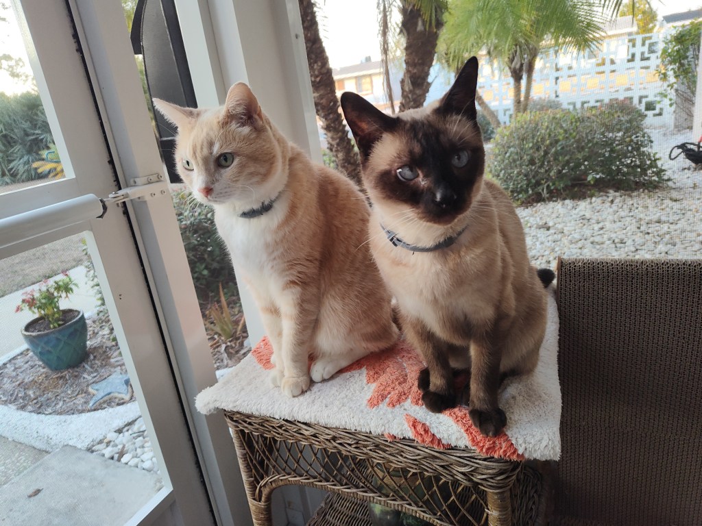 We had a couple of guests over for dinner yesterday evening. Before eating we sat on the catio and had some wine and cheese. Of course, Frankie and Floki were both interested in what we were doing.