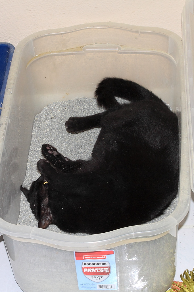 Puck rolling in litter boxBut then we discovered it is common for cats to do this. It is called a “dust bath” and naturally, this is supposed to be done in the dirt, but our inside cats have no access to dirt so this is the best they can do.