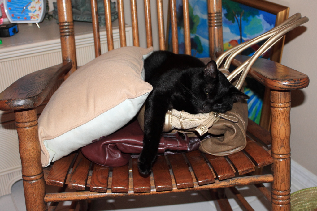 I don’t know why but cats seem to have a fascination with lying on purses. So when Rose put several purses on a chair (temporally), Puck couldn’t resist napping on them.