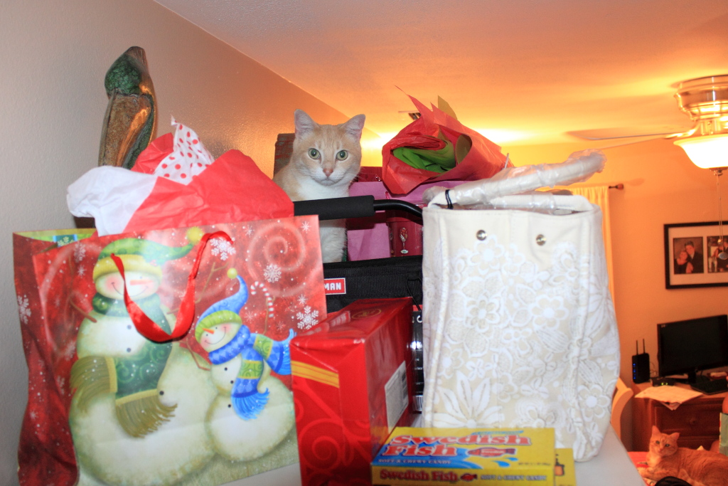 Since we put the Armour in the spare bedroom, all the cats like getting on top of it but Frankie has somewhat taken over that space as his own. Since our living area is somewhat limited, lately Frankie’s space has been invaded by Christmas related stuff. We needed a place to store gifts and other stuff while preparing for Christmas. As you can see, Frankie was not too thrilled about losing his spot.