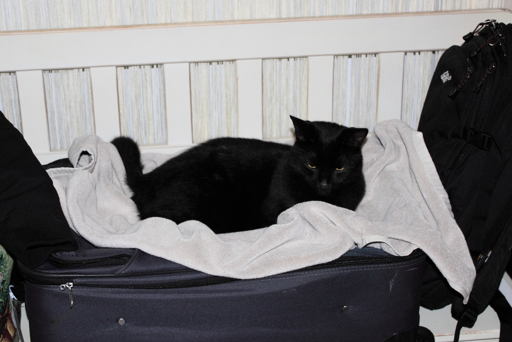 The other day my stepson Nick flew down from Massachusetts to visit us for the Christmas holiday. Of course, bringing new things into the house is like a cat’s version of a new attraction at Disney World. Nick’s suitcase was of particular interest. They all had to take turns laying on it like it was their own personal bed.