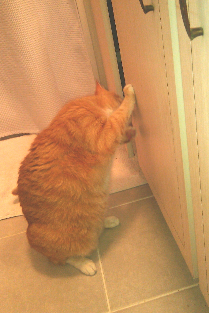 But this hole was not like that one. This hole was almost big enough to shove a body into and definitely big enough for a cat, even a fat, bad cat. I discovered that when Chris opened the cabinet door and walked inside. It was then that I remembered what Rose warned me about and I quickly looked under the sink to see what she was talking about. When I saw the opening, I grabbed Chris and pulled him out of there. He was not happy about that and let me know.