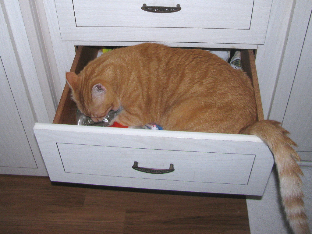 When we were unpacking I thought I would just stick the catnip in that drawer for the time being…forgetting that Chris is smarter than the average bear…we always have to stay one step of him!
