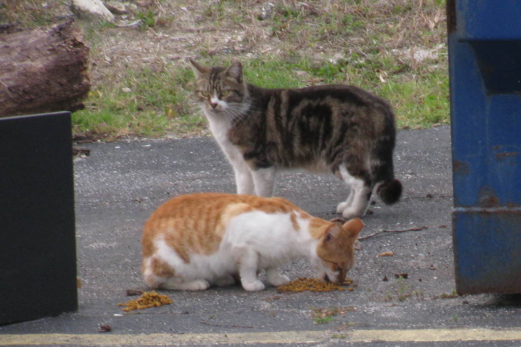 Lately, I have been taking pictures of the feral cats at work almost every morning when I feed them. Of course, this isn’t everyday because I work four days a week, sometimes five. Also, there are not always cats around when I put food out, but I wanted to share with you some of the pictures I have taken recently.