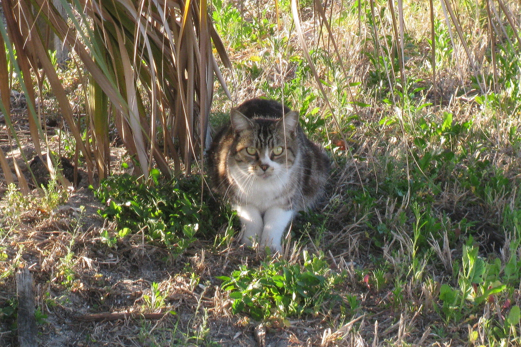Monday, March 7 – The cat to the far left of the picture below is the shyest of the three and is difficult to photograph because he is usually, but not always, too far away.