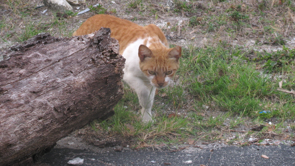Thursday, March 10 – The bulls-eye tabby sometimes is waiting along the fence about 100 feet away when I arrive while the gold cat is waiting closer. After I go inside to get their food, she moves in closer.