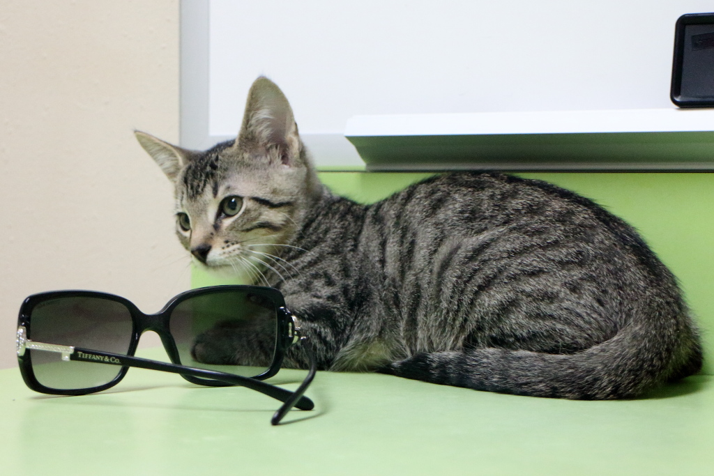 We first went to an examination room that held the female kitten that needed a home. Her two brothers were in there also and all three of them were very cute and playful. The female had unique markings. She had sprinkles of gold but she wasn’t technically a Calico or Tortie. I don’t know exactly how that works but Felice says in both cases they have black patches, which this kitten doesn’t have. Wikipedia does mention a “Tortie-Tabby” or “Torbie” which is what this kitten might be.