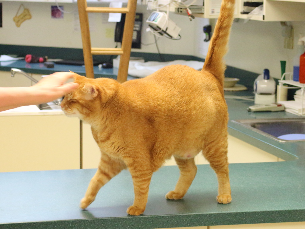 After I shot the above video, we put the kitten on a table where a very overweight gold cat with bent whiskers was hanging out looking for attention.