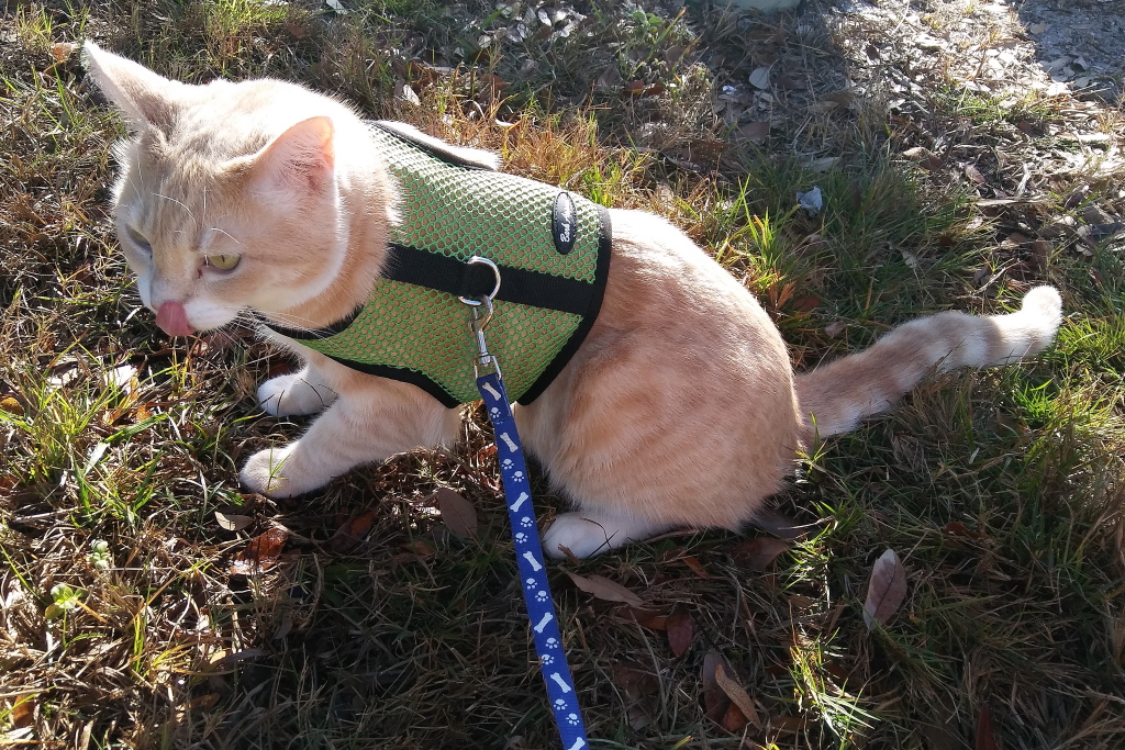 cat Frankie outside on harness