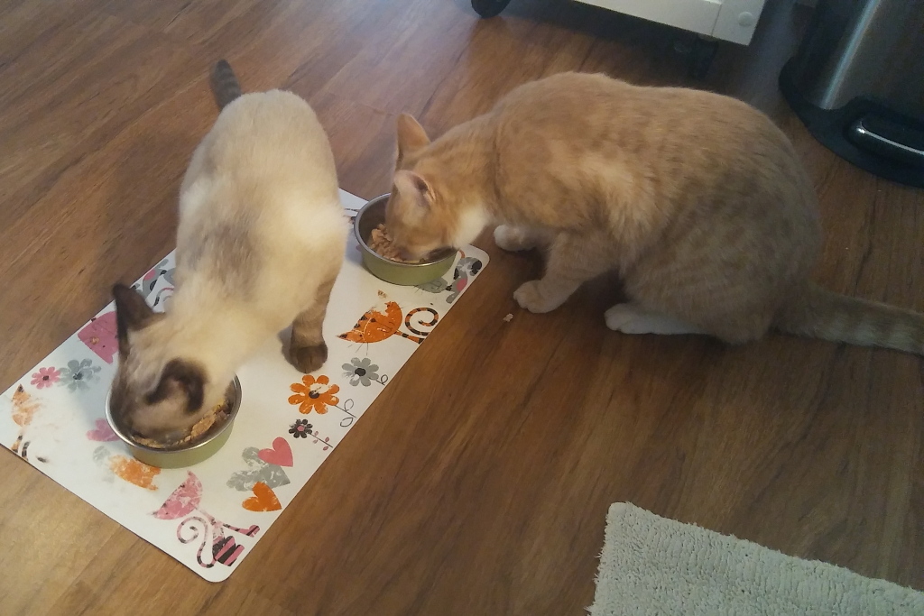 Of course, I was new to dealing with kitties then. Now I’d just shake the kitty treat bag, a sound my current kitties (Andy and Dougy) know means “come running”!