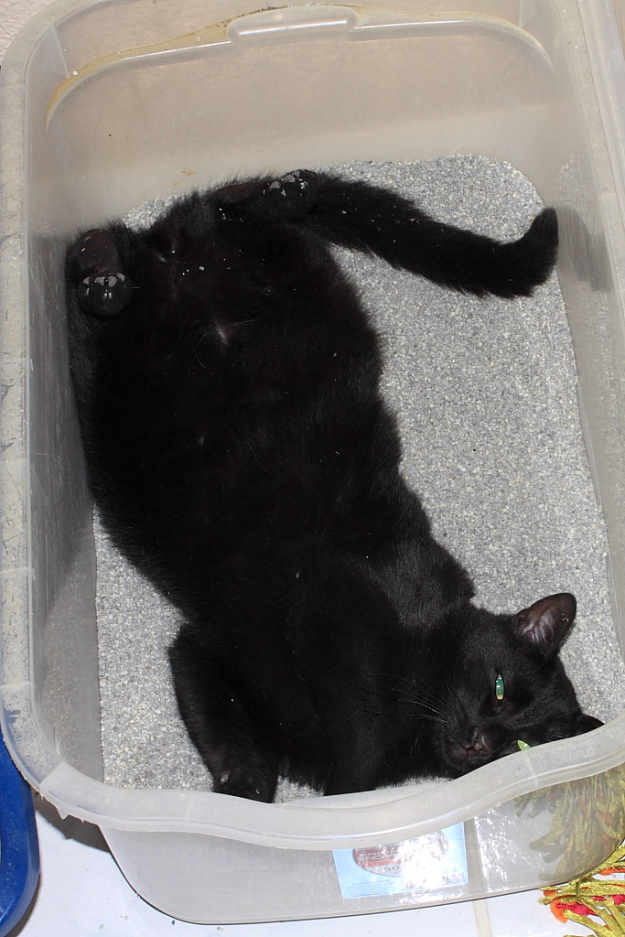 Puck rolling in litter boxBut then we discovered it is common for cats to do this. It is called a “dust bath” and naturally, this is supposed to be done in the dirt, but our inside cats have no access to dirt so this is the best they can do.