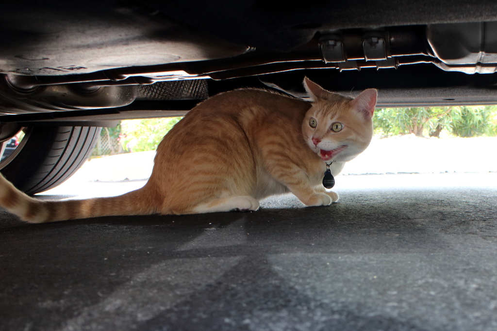 Our cat Frankie under a car