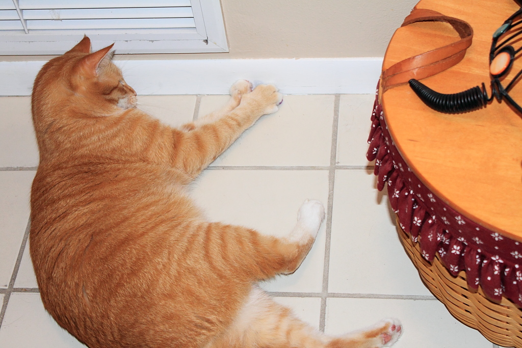 Chris is one of those cats that continued to play like a kitten well into adulthood. Lately, however, the kitten in him did not come out very often. That changed the other day when Rose found a mouse under the refrigerator. It was a small mouse that I had never seen before. It must have found its way under the fridge shortly after coming out of the package.