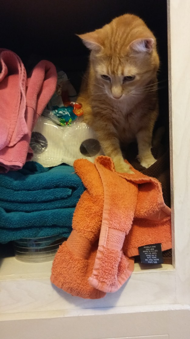 The other day, after I got out of the shower, Frankie turned his attention to the linen closet. He got up on the toilet seat and opened the closet door for a peek inside. He looked up and down for a place to jump up onto but decided against it after seeing how full it was.
