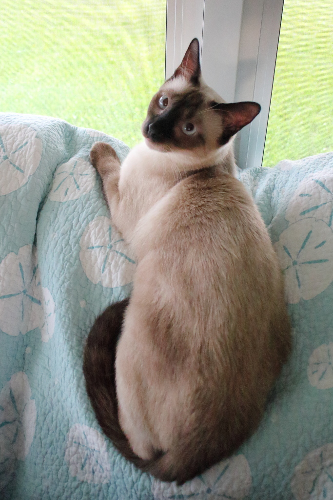 The sofa is a great place to lie and look out the window but I’m not sure how hanging over the edge is comfortable for Floki.