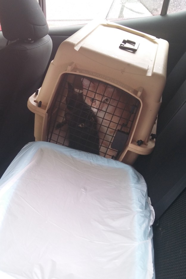 At 10:00 a.m I heard the roads were open so we packed our stuff up and put the cats their carriers. This time Felice gave us a carrier so they were all able to ride home in relative comfort.
