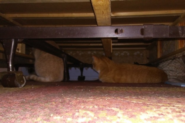 When we got to Felice and Jeff’s house they had a bedroom set up for us with two litter boxes. We put the cats inside and that is where they stayed. Everbody hid under the bed at first, even Chris, who was way more stressed than I expected him to be.