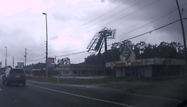 A tree had fallen over the road out so I had to turn around and go around the block. The damage to buildings in the area seemed minimal, except for an unlucky few. There were a fair number of trees down and lots of branches on the roads but overall it was much better than expected. Almost half the traffic lights were out and everyone here thinks they need to treat them as a two-way stop. I think the most surprising thing I saw was a billboard that looked like Godzilla attacked it.
