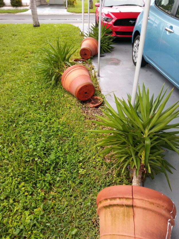 I went straight home with the cats and Rose went to check on her mother’s house. Her home survived but she had no power. When I entered our neighborhood, I saw two homes at the end of our street with part of their roofs ripped off. There was also a palm tree lying half way across the street. That worried me a little but the only damage I saw to our house was that three large planters blew over and two of them cracked, one of which was already cracked. We even had power and our alarm clock wasn’t blinking so we never lost power.