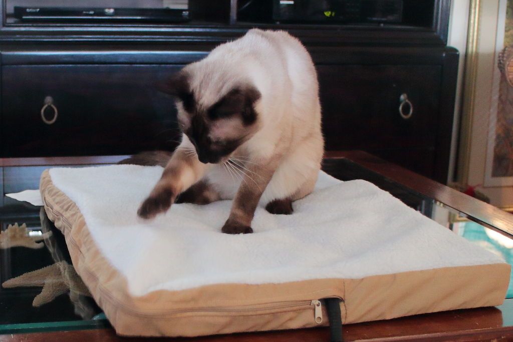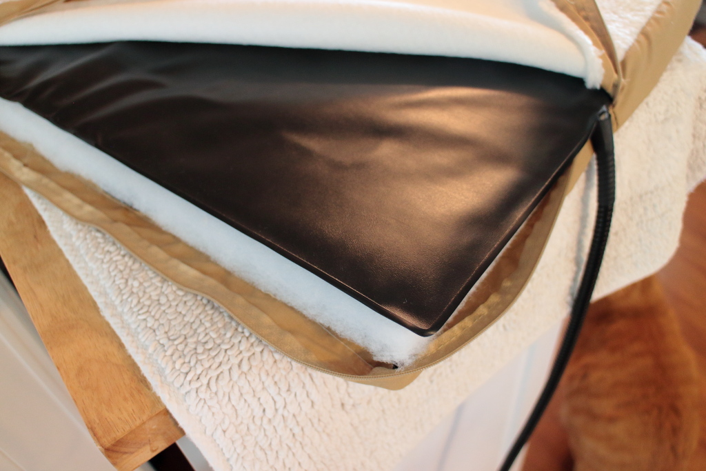 It is not as warm as I expected. I don’t have a thermometer but I would guess it is somewhere between room temperature and a heating pad on low. Perhaps 90 degrees Fahrenheit. At first, I thought that was bad but then realized that a heating pad is for temporary use and shouldn’t be used for more than 20 minutes. At this lower temperature, I would guess that it could be used much longer or indefinitely. I picture a bunch of scientists in lab coats over at Art of Paws trying to figure out the perfect temperature. For more information about this product, you can visit https://artofpaws.com/products/heated-pet-mat