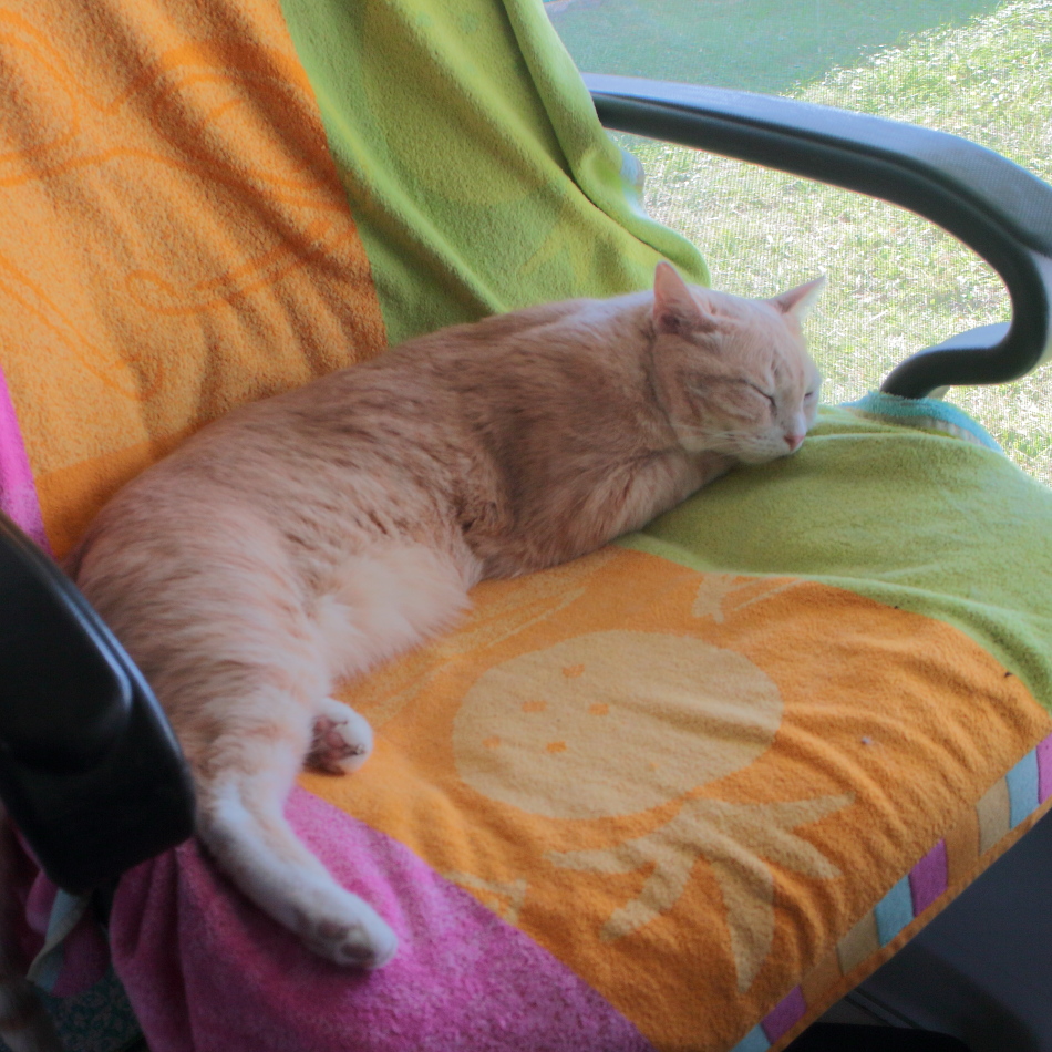 Recently, Rose started pushing her office chair near the window when she is done using it. Frankie figured out it is a great place for a nap and spends much of his nap time now on her chair, including now as I write this.