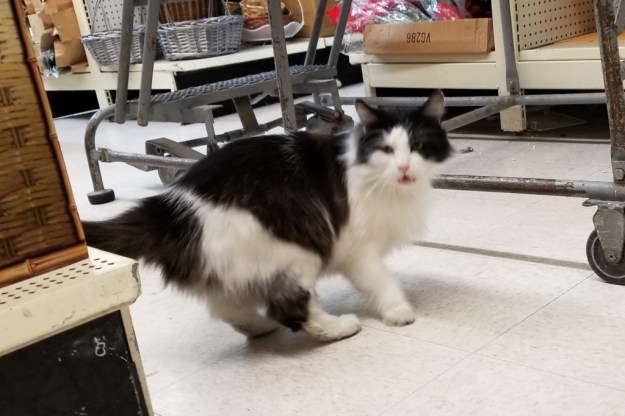 There is a store near me in Largo, Florida that is literally named “World’s Most Unusual Dollar Store.” It is like a mom and pop Big Lots with a lot of cheap, Chinese made products but also some unusual items, hence the name. I was in there recently when I heard a cat meowing over and over again. I turned to see where the noise was coming from and saw a cat walk by the end of the aisle I was in.