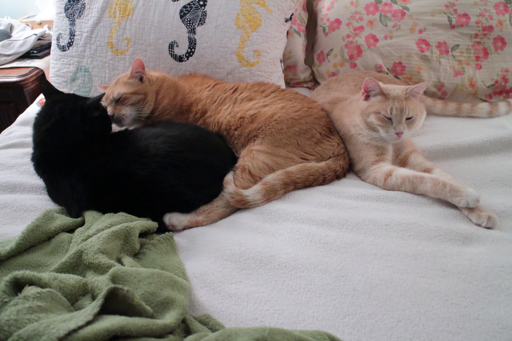 Here is Puck, Chris, and Frankie. I have seen three cats together on our bed quite often lately but, unfortunately, Puck is not one of them (Puck died 13 days later).