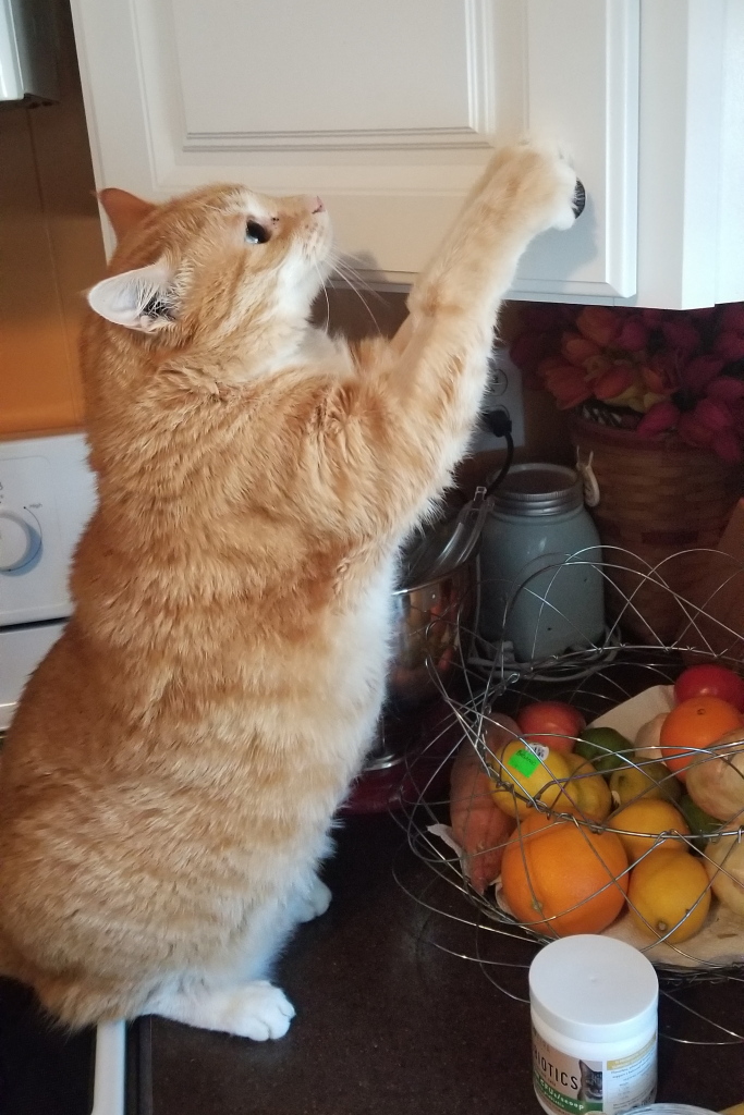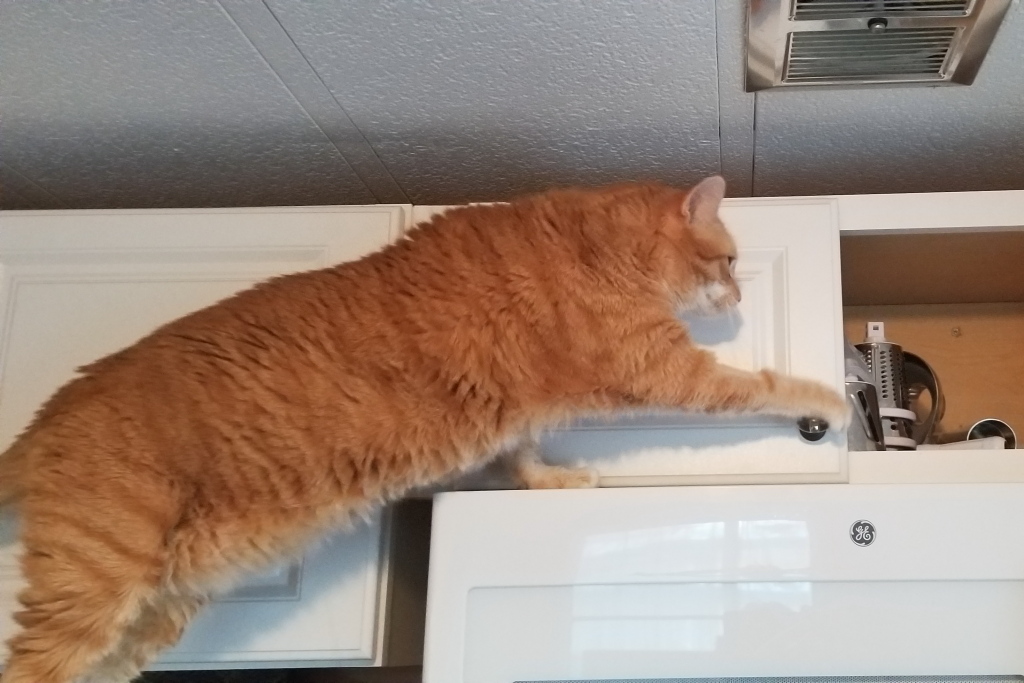 Chris is still a baby! Cody is 11!! I think your issues with Chris stem from the fact that I think he is EXTREMELY intelligent!! Cody would NEVER venture up that high, let alone open cupboards when he got up there! Chris is one BRILLIANT (as well as extremely handsome) cat!