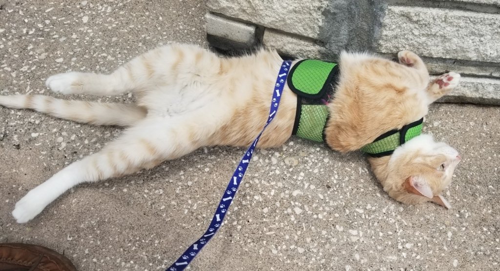 Usually he will stop to roll in the grass but this time the sidewalk was a good substitute.
