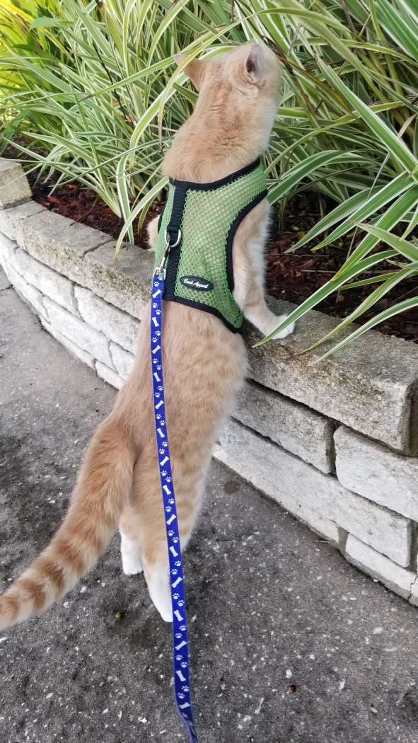 I use the harness on Frankie because he likes to run away. I worry that he will get lost or hit by a car or something. I don’t use a harness for Chris because he is overweight and easy to catch. Plus he tends to like to stick around the house and eat grass. I tryed to use a harness on Chris when he was younger but he resisted too much and somehow managed to get out of the harness like Houdini. Frankie quickly learn to accept the harness. In fact when I take it out he gets excited because he knows he’s going outside.
