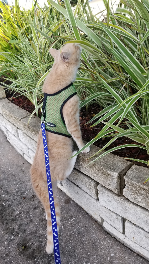 You just have to remember that you can’t walk a cat like you walk a dog. They have to walk you. if you try to force them in a particular direction they will resist. I usually end up having to carry Frankie home after a while.