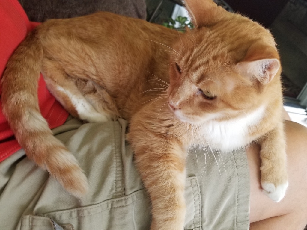 Pumpkin has always been a friendly cat and would often sit next to me while I petted him but he was never much of a lap cat. I put him on my lap a few times but he would usually get down after less than five minutes, usually sooner. This time he stayed on my lap for a long time.