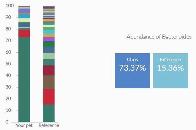 According to the report, Chris has an abundance of Bacteroides, which I will discuss later. The rest of his microbiome seems relatively normal but because there are too many of one bacteria, the rest are equally diminished, with some exceptions.