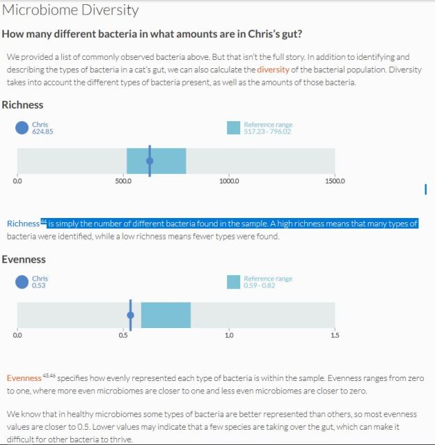The diversity is how many different types of bacteria are present. Generally, a diverse variety is a good thing and Chris is about average here although his evenness score is a bit off, probably because of the too many Bacteroides in his system. The good news is his overall diversity is in the normal range.