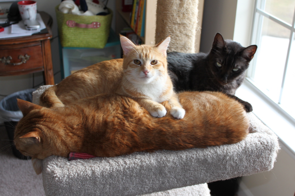 Here is a photo taken in Late December, 2009. Chris was relatively new to our home and the other cats would typically exclude him in there little get-togethers. Unfazed by the slight, our Baby Huey would join them anyway.