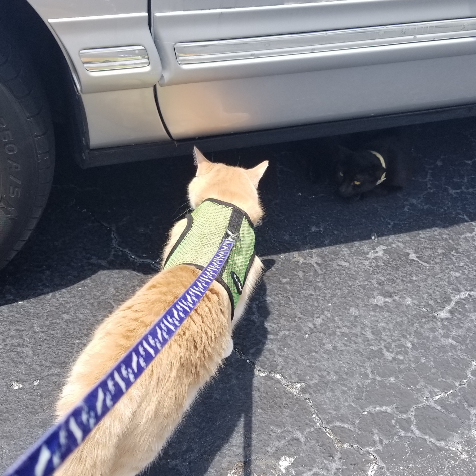 I’m sure he appreciated the chance to be outdoors….and even though the “under the car” cat wasn’t open to a meet and greet at least he/she must be somewhat used to other cats to allow him that close. He left a calling card out there so other cats – ferals, etc. – know there’s a cat in town!