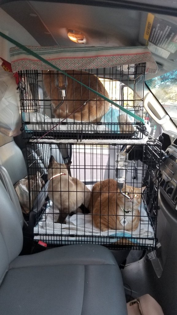 This morning we got up at five but had so much to do that we were not ready to go until 7:45. We put Chris and Floki together on the bottom and Frankie by himself on the top and then strapped them in.