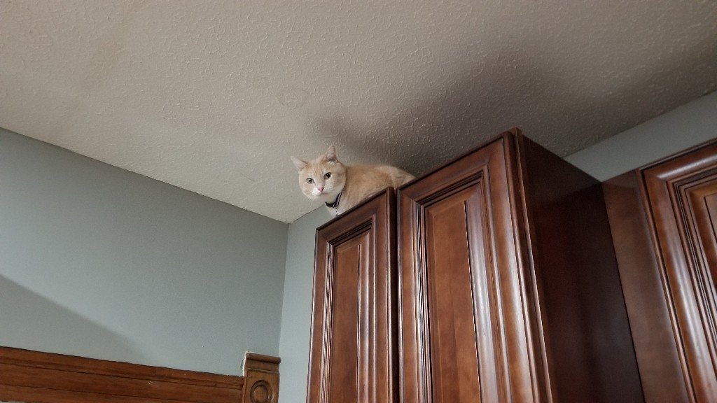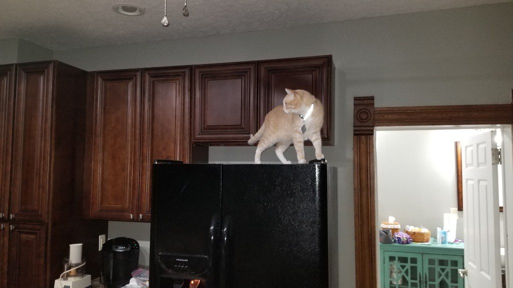 When we were done Rose let the cats out to explore while I was still outside doing something. When I came in I couldn’t find any of the cats. I looked around downstairs and then went upstairs and found Chris at the top of the stairs looking down. We were worried that Chris’s age and weight would keep him from going up the stairs but we were wrong.