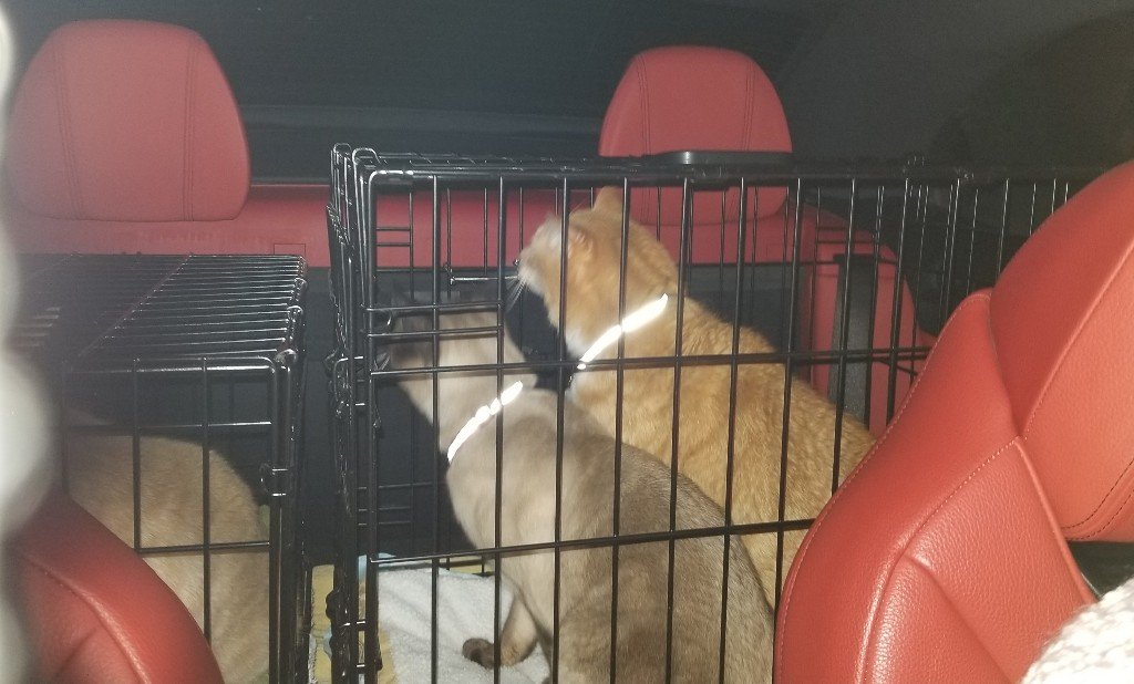 So I had to empty everything that was in the trunk. As I was doing that Rose informed me she caught Floki and put him in the crate. I went inside and helped get Chris, who we put with Floki, and the Frankie, when is flying solo. I then put the last litter box in a big garbage bag.