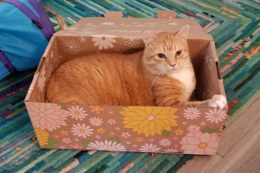 Chris looks like he’s a laid back hippy type artist in that box! It fits him purrfectly too!