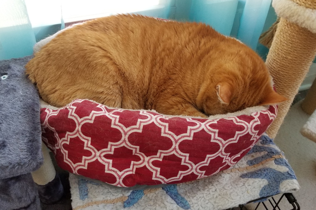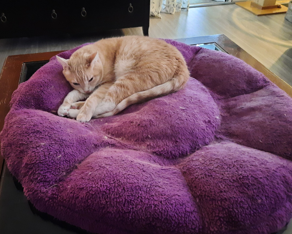 Teddy has the whole house for a bed but does have some spots he prefers. He’s not a cat bed kind of guy though. When he’s outside he has a favorite spot under a shrub. Wherever the mood hits, that’s his nap spot!