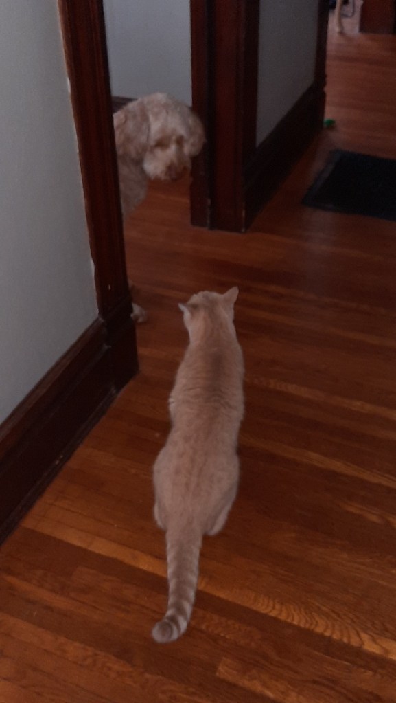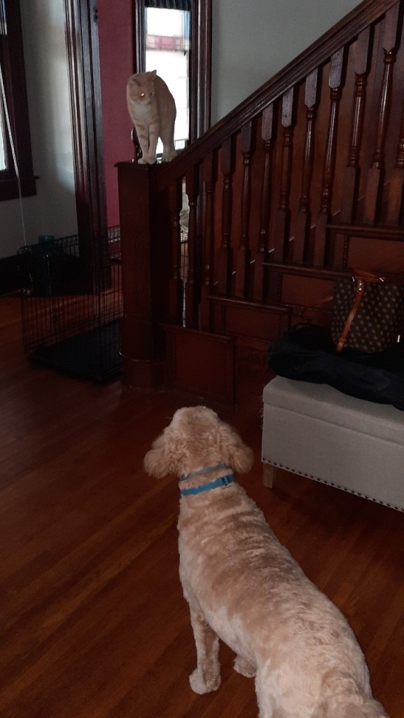Of course, I don’t want to see any fights, but I was a little proud of how Frankie stood his ground to protect his territory. It is his house and if he wanted to be downstairs he was going to be downstairs.