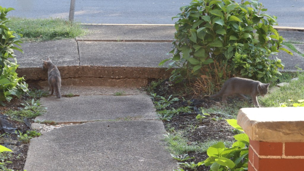 In a recent post I talked about a stray kitten that came up to our catio door to check us out. This kitten was not afraid of people and sniffed my hand when I put it up to the screen. I also said I thought I saw another kitten but I wasn’t sure. Now I am sure, or at least pretty sure. There seems to be two kittens that hang out together. These pictures were taken through my front door window yesterday morning. Please forgive the less-than-great quality.