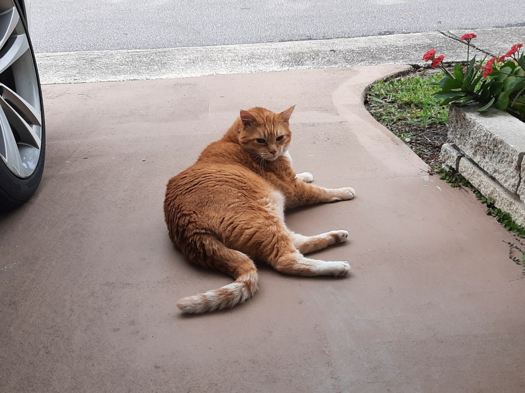 I hung around with Chris for a while, watching him eat grass and relax on the cool concrete. After about ten minutes he was done and asked me to open the door for him.
