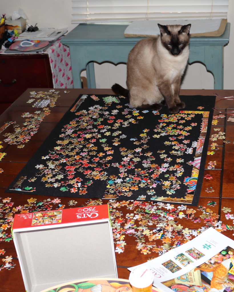 Robin May 23, 2022 at 8:55 pm That looks like a tough puzzle! Good for Floki for finding a piece. I enjoy puzzles too. I can’t do them in my apartment as my kitties like to “assist” by reducing the number of pieces that I have to work with. Reply ↓