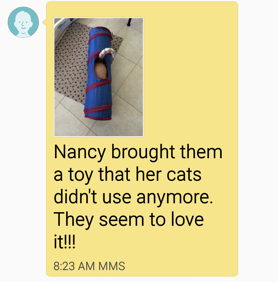 We loved it when Lynn watched our cats. Unfortunatly, she can’t do that anymore.