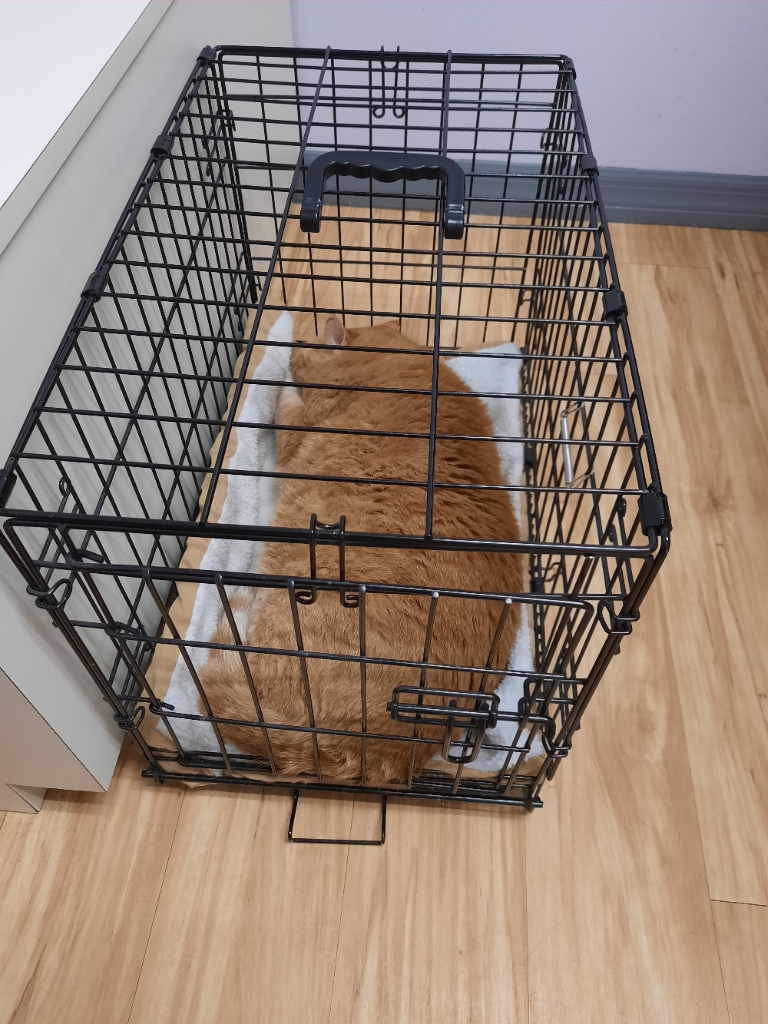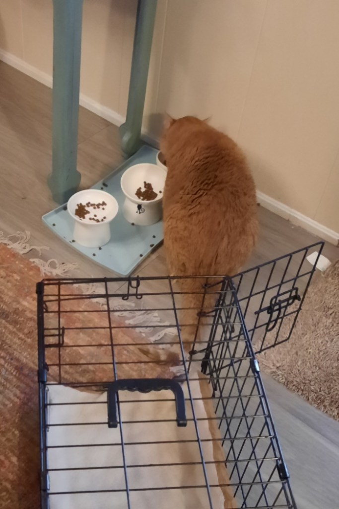 When we got home I put him inside the kitchen and opened the crate which happened to be a short distance from the food bowl. I’m sure you can guess what happened next.