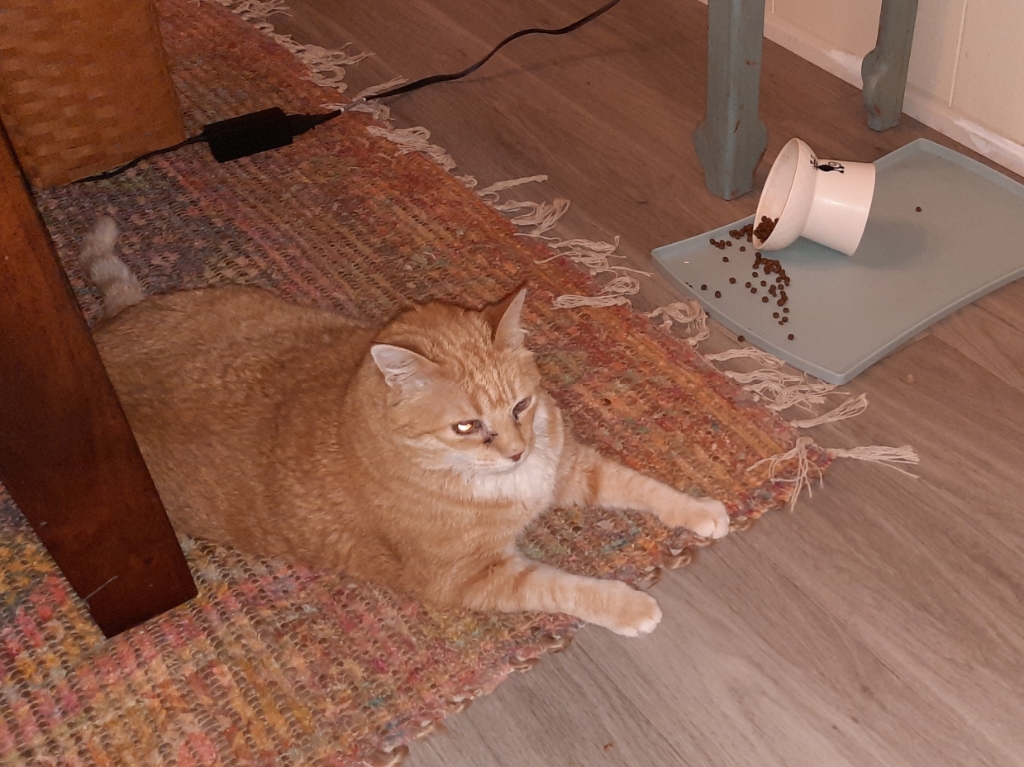 My wife sometimes doesn’t sleep well and gets up for a couple of hours in the middle of the night. She was up very early this morning and came back to bed when I got up. When I walked out to the dining room I saw all three cat bowls sitting on the table and a bunch of cat food on the floor inside the catch-all mat. I picked up the mat and dumped all of the food back into one of the bowls and put it back down on the floor.