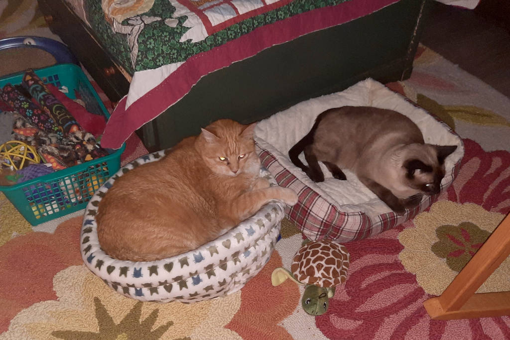 I think they’re happy in a snuggly bed of any size, put anywhere, as long as they have it all to themselves – Teddy squeezes into some of his old beds sometimes and ignores the bigger ones AND vice versa. They do keep us on our toes!
