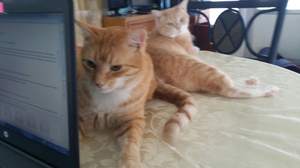 My wife started a new job a few months ago that allows her to work from home a couple of days per week. The company provided her with a laptop and she had been working on a small table on our patio. The cats are all interested in “helping” her with her work, especially “Chris” who helps the most.
